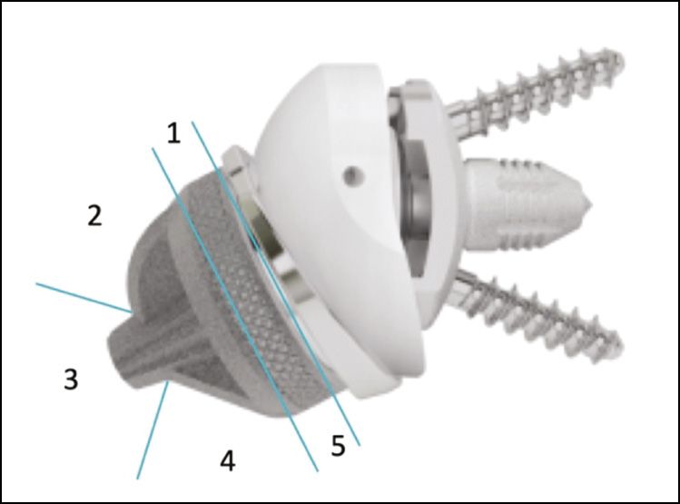 - The mechanical constraints exerted by the reverse implant and the upwards shearing force require a solid primary fixation to allow for early rehabilitation. Solid bone integration seems mainly to occur around the ring. There is poor integration around the fins and post, as we have found for the few cases we have had to remove a stemless implant (Fig. 2).