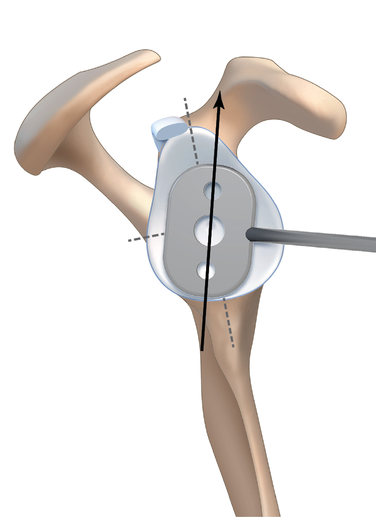 The glenoid construct should be fully seated in the cavity and the top screw should target the base of the coracoid process. (Fig. 15).